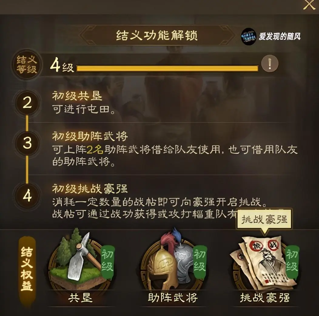 结义功能除了初期屯田外,中后期挑战豪强也相当关键。如果你原来的结义有些人员下赛季不同区了,建议提前更换结义人员,下赛季开荒就能更快升级结义等级,获取结义商店的物品了。