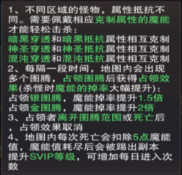 该BOSS玩法进入副本后拥有100点魔能值,该玩法主要掉落魔能装备,集齐套装可以激活套装效果,对圣印属性加成十分之大!具体玩法如下图。